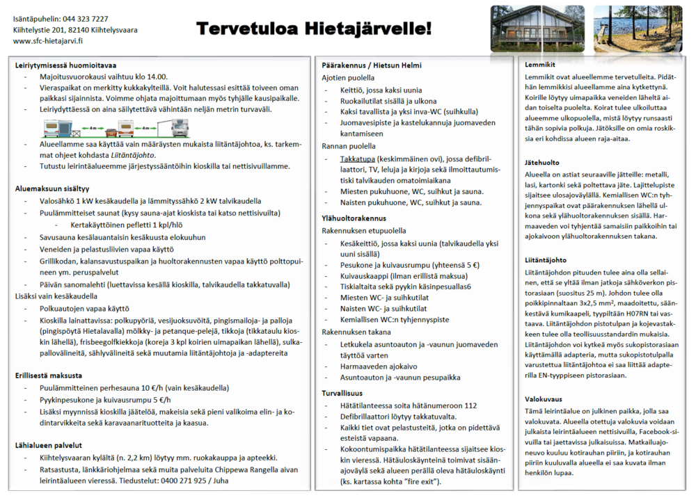 SFC Hietajärvellä on alkanut talvikausi 31.8.25 ja alueella saa majoittua vain SFC jäsenet ja ilmoittautuminen ja aluemaksun maksaminen tapahtuvat takkatuvalla.